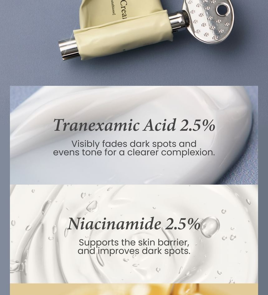 Water, Glycerin, Dicaprylyl Ether, Hydrogenated Polydecene, Octyldodecanol, Butyrospermum Parkii (Shea) Butter, Niacinamide, Tranexamic Acid, Pentaerythrityl Tetraethylhexanoate, Panthenol, 1,2-Hexanediol, Arachidyl Alcohol, Myristyl Alcohol, Cetyl Alcohol, Dipentaerythrityl Hexahydroxystearate/Hexastearate/Hexarosinate, Cetearyl Olivate, Behenyl Alcohol, Sorbitan Olivate, Ammonium Acryloyldimethyltaurate/Vp Copolymer, Arachidyl Glucoside, Garcinia Cambogia Fruit Extract, Hydroxyacetophenone, Helianthus Annuus (Sunflower) Seed Wax, Palmitic Acid, Stearic Acid, Citric Acid, Ceramide NP, Carbomer, Ethylhexylglycerin, Disodium Edta, Glutathione, Butylene Glycol, Tocopherol, Centella Asiatica Extract, Houttuynia Cordata Extract, Sodium Hyaluronate, Hydrolyzed Hyaluronic Acid, Sodium Acetylated Hyaluronate