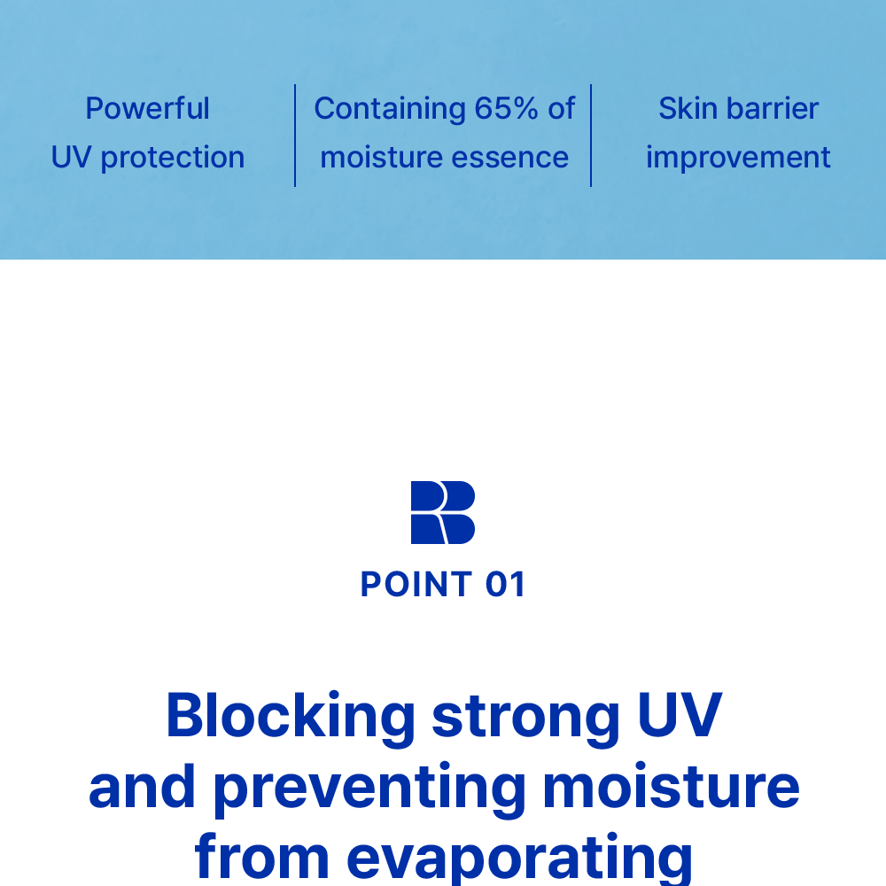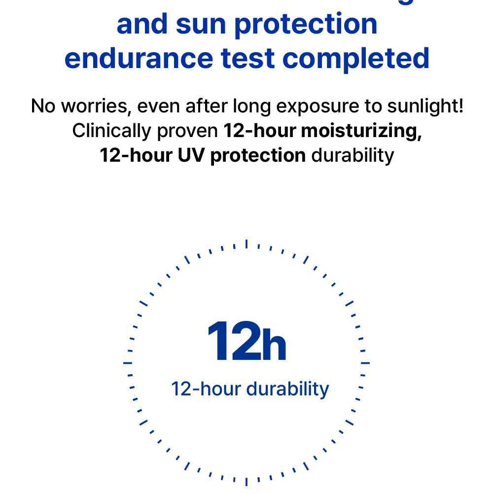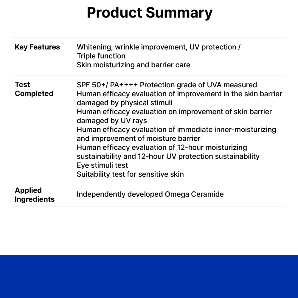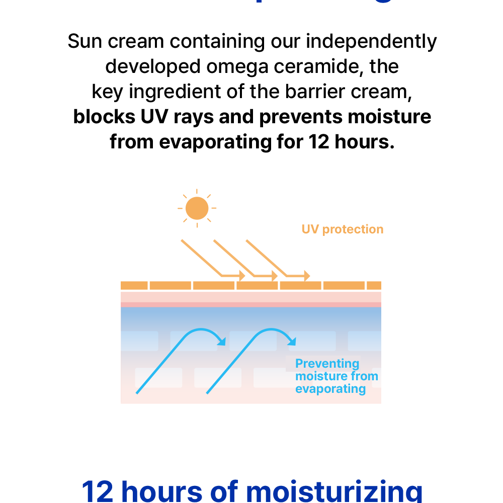 -Sunscreen containing independently developed omega ceramide, a key ingredient in skin barrier cream, simultaneously blocks UV rays and moisture evaporation for 12 hours.