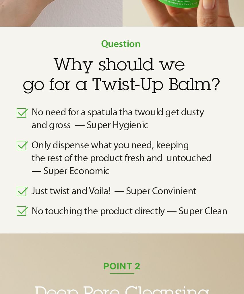 Hygienic Twist-up Design: Innovative twist-up packaging ensures a fresh and uncontaminated balm for each use—no need for a spatula!