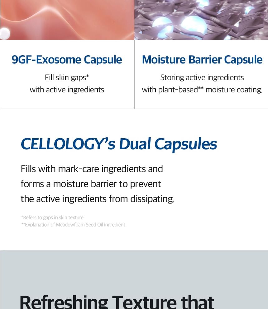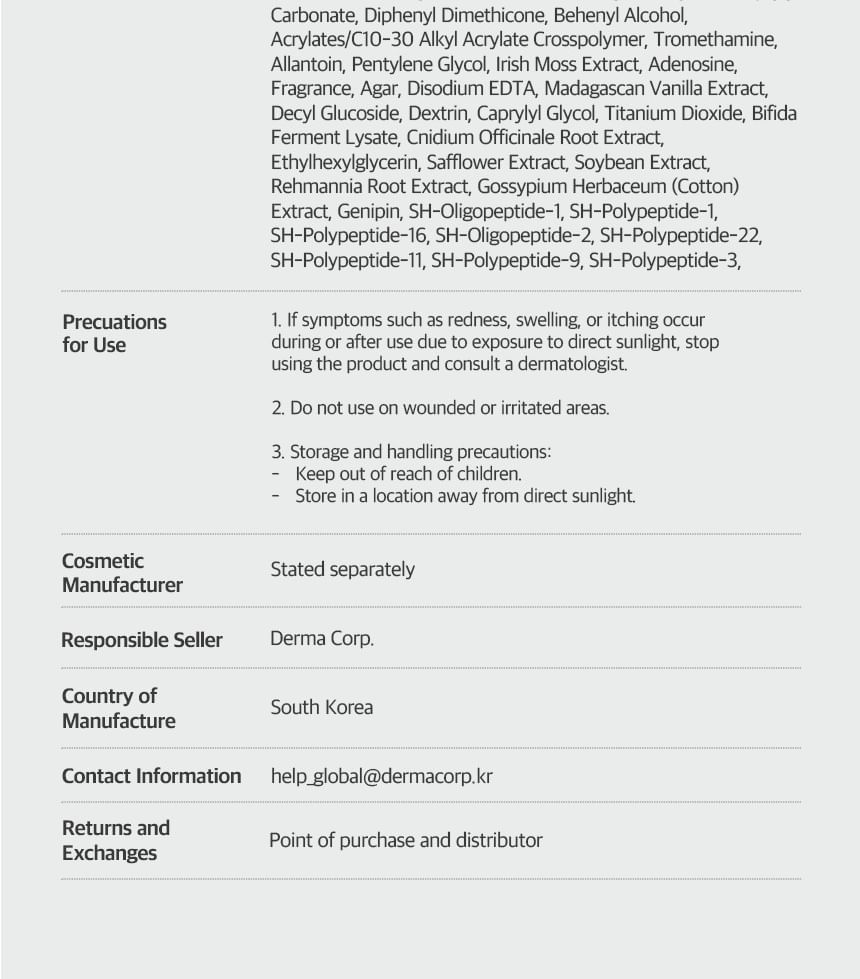 Water, Limnanthes Alba (Meadowfoam) Seed Oil, Propanediol, 1,2-Hexanediol, Glycerin, Niacinamide, Butylene Glycol, Diethoxyethyl Succinate, Diphenyl Dimethicone, Behenyl Alcohol, Acrylates/C10-30 Alkyl Acrylate Crosspolymer, Tromethamine, Allantoin, Pentylene Glycol, Chondrus Crispus Powder, Adenosine, Fragrance, Agar, Disodium EDTA, Madecassoside, Decyl Glucoside, Dextrin, Caprylyl Glycol, Titanium Dioxide(CI 77891), Centella Asiatica Callus Extracellular Vesicles, Gardenia Florida Fruit Extract, Gellan Gum, Ethylhexylglycerin, Crocus Sativus Flower Extract, Elettaria Cardamomum Seed Extract, Foeniculum Vulgare (Fennel) Seed Extract, Coriandrum Sativum(Coriander) Extract, sh-Oligopeptide-1, sh-Polypeptide-1, sh-Polypeptide-16, sh-Oligopeptide-2, sh-Polypeptide-22, sh-Polypeptide-11, sh-Polypeptide-9, sh-Polypeptide-3, sh-Polypeptide-62