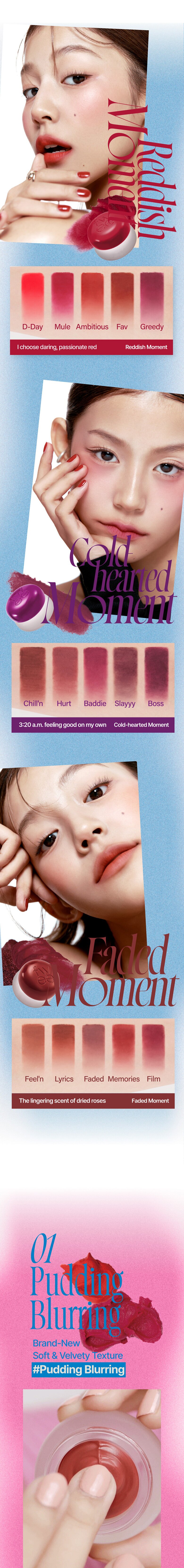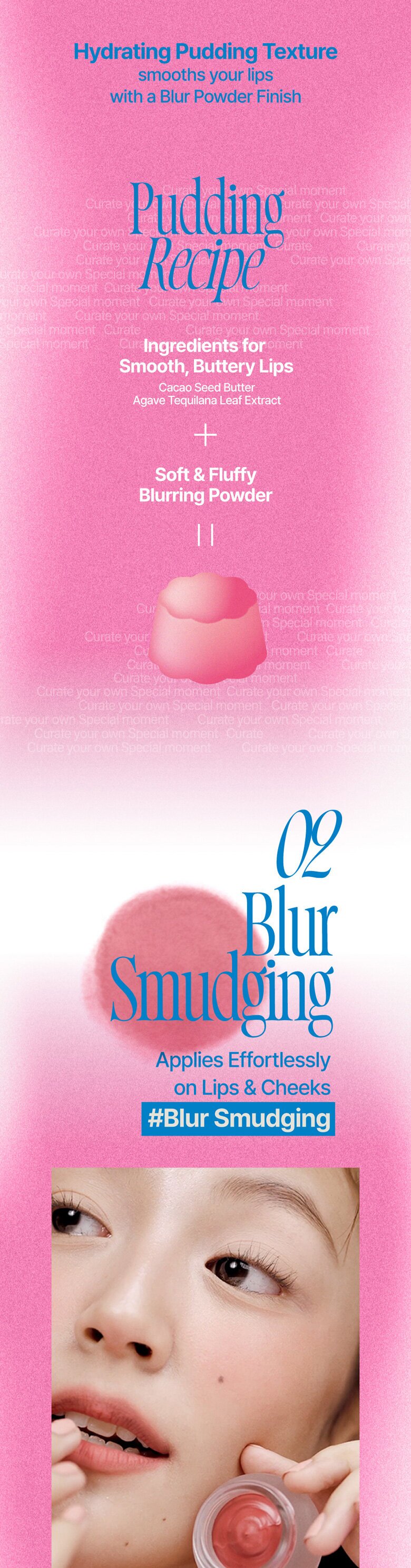 - The fluffy moisturizing pudding formula combined with blurring powder fills lips comfortably and blurs wrinkles and pores.