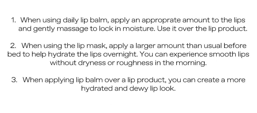 When used as daily lip balm, apply an appropriate amount on lips and layer lip makeup product on top.
