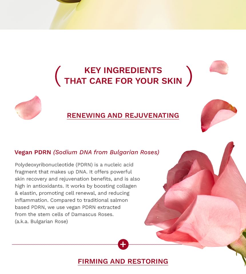 Contains vegan PDRN ingredient sourced from bulgarian roses that boosts skin cell renewal and reduce inflammation to renew and rejuvenate skin.