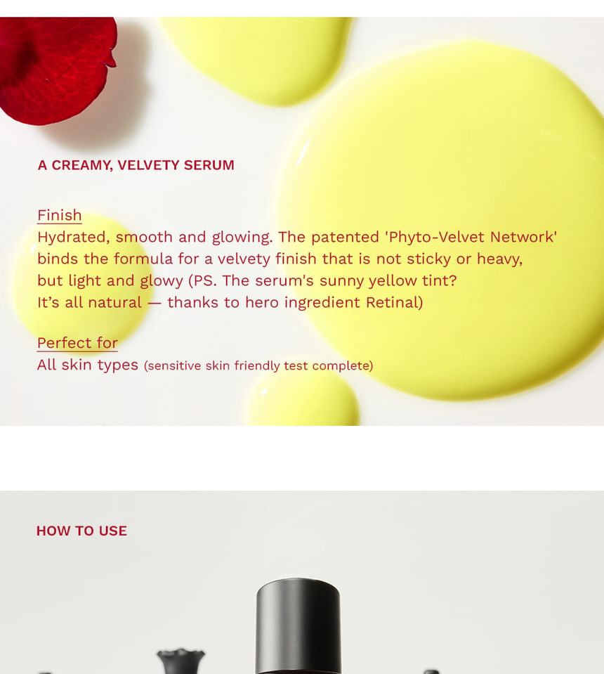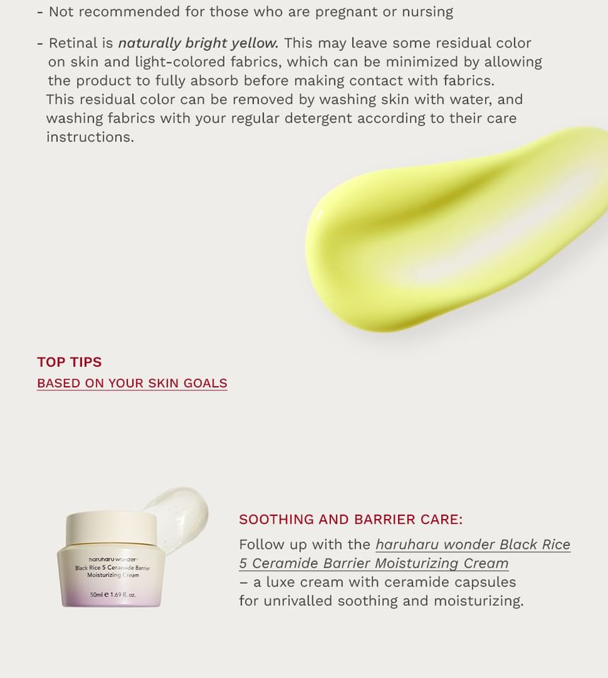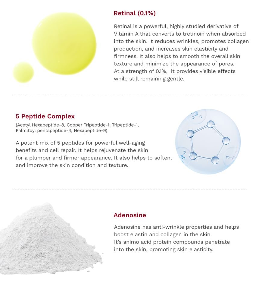 Formulated with 0.1% Retinal, 5 types of Peptides, and Adenosine to synergize for powerful well-aging and skin firming benefits.