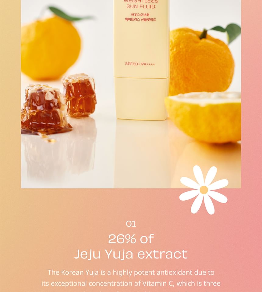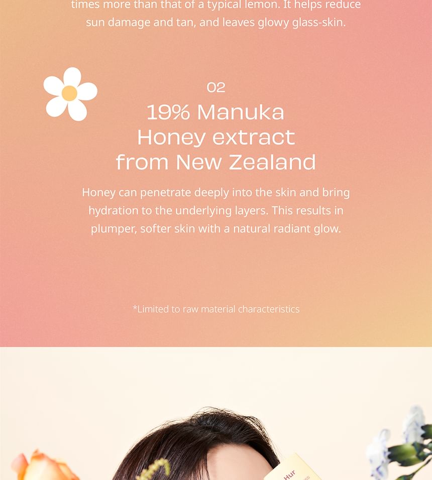 Contains a high concentration of 26% Jeju Yuja Extract and 19% pure New Zealand Honey Extract to nourish skin intensively and fight sun damage for achieving glowing and glass-like skin.