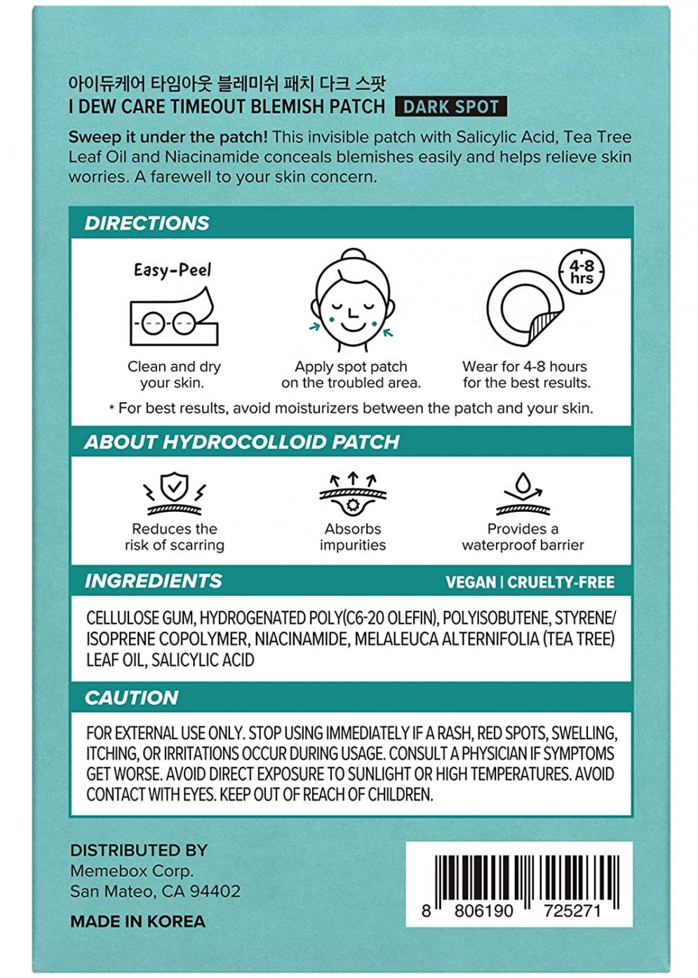 # Dark spot: Tea Tree Leaf Oil, Centella Asiatica Extract, Hydrocolloid, Niacinamide