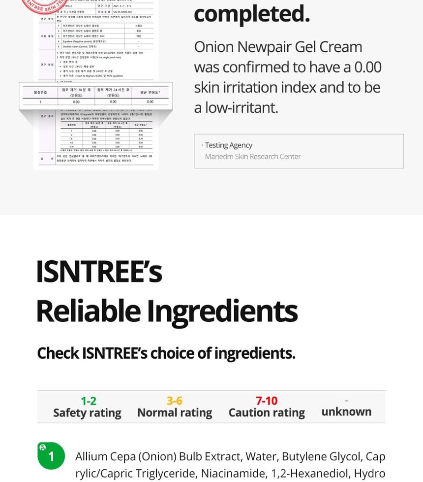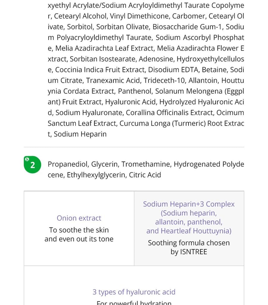 Allium Cepa (Onion) Bulb Extract, Propanediol, Glycerin, Water, Butylene Glycol, Caprylic/Capric Triglyceride, Niacinamide, 1,2-Hexanediol, Hydroxyethyl Acrylate/Sodium Acryloyldimethyl Taurate Copolymer, Cetearyl Alcohol, Vinyl Dimethicone, Carbomer, Cetearyl Olivate, Sorbitol, Sorbitan Olivate, Biosaccharide Gum-1, Sodium Polyacryloyldimethyl Taurate, Sodium Ascorbyl Phosphate, Tromethamine, Melia Azadirachta Leaf Extract, Melia Azadirachta Flower Extract, Sorbitan Isostearate, Hydrogenated Polydecene, Ethylhexylglycerin, Citric Acid, Adenosine, Hydroxyethylcellulose, Coccinia Indica Fruit Extract, Disodium EDTA, Betaine, Sodium Citrate, Tranexamic Acid, Allantoin, Houttuynia Cordata Extract, Panthenol. Solanum Melongena (Eggplant) Fruit Extract, Trideceth-10, Hyaluronic Acid, Hydrolyzed Hyaluronic Acid, Sodium Hyaluronate, Corallina Officinalis Extract, Ocimum Sanctum Leaf Extract, Curcuma Longa (Turmeric) Root Extract, Sodium Heparin