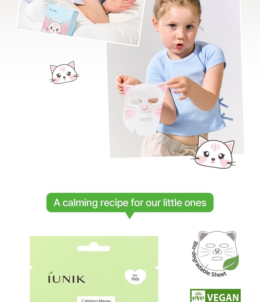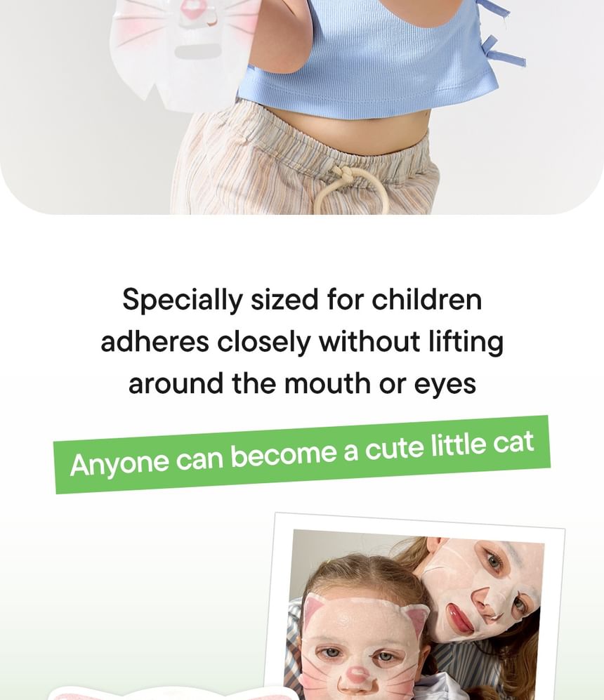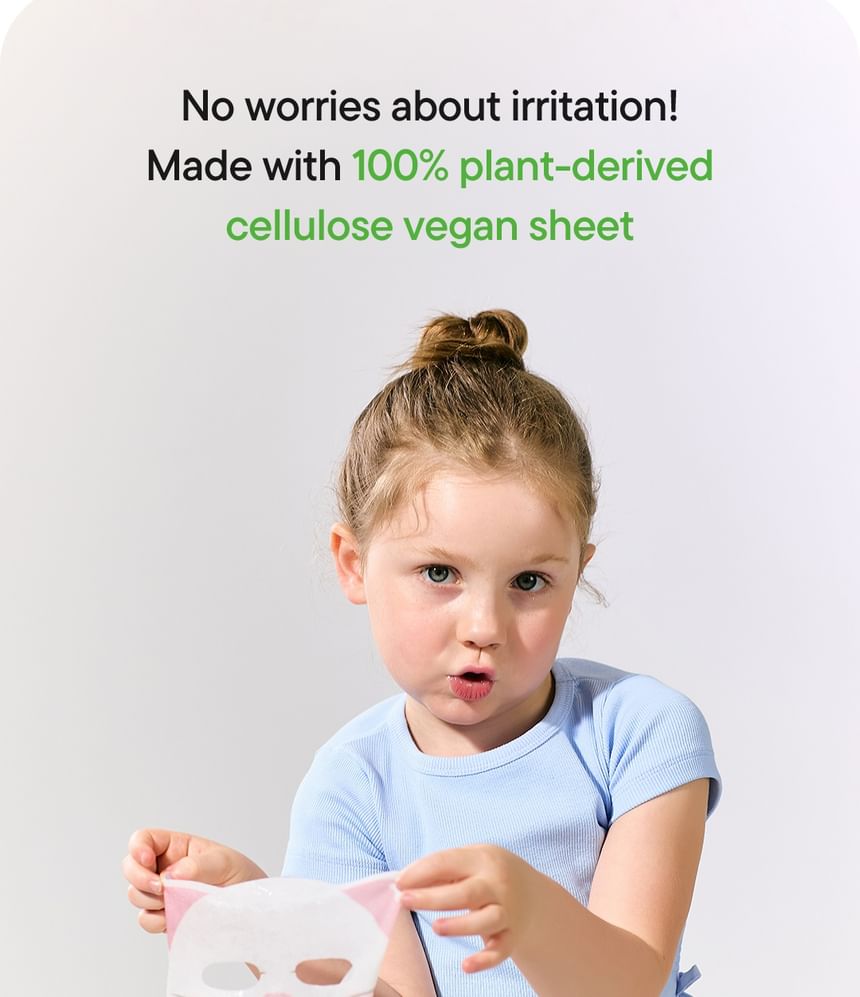 Features a cat-shaped vegan sheet made with 100% plant-derived cellulose, specially sized for children.