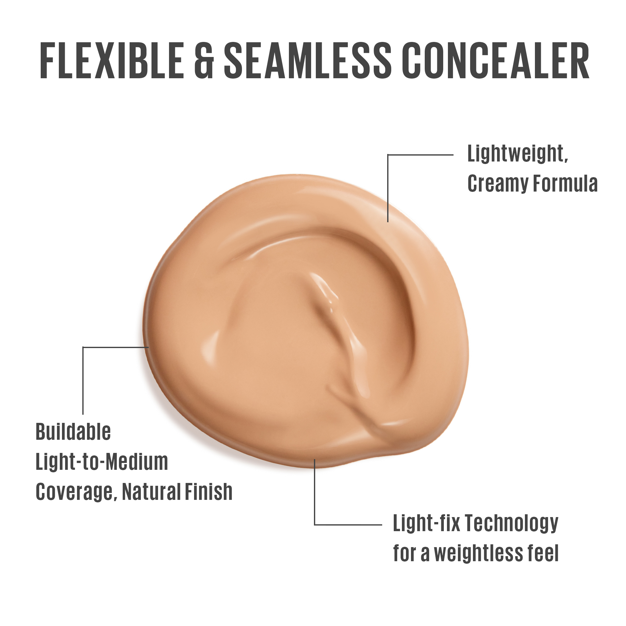 - A buildable, light-to-medium coverage, creaseless concealer that has a light-as-air feel.