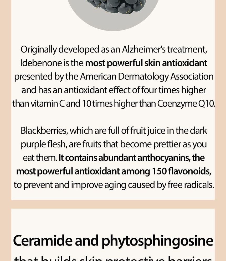 Powered by Idebenone and a blackberry anthocyanin complex to deliver superior antioxidant protection, helping prevent premature aging while improving skin tone, elasticity, and resilience.