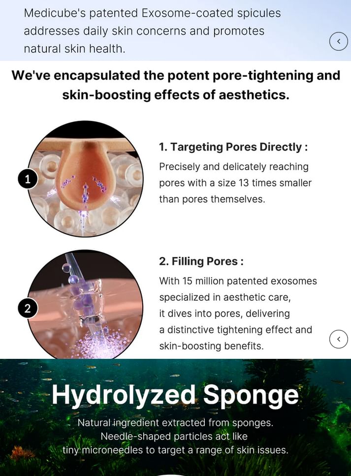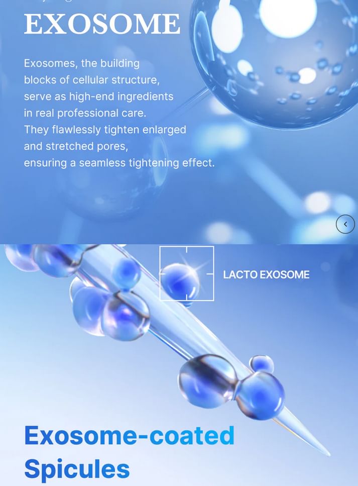 This product’s micro-needling-like spicules are enriched with 25000ppm of exosomes for intensive pore care effects.