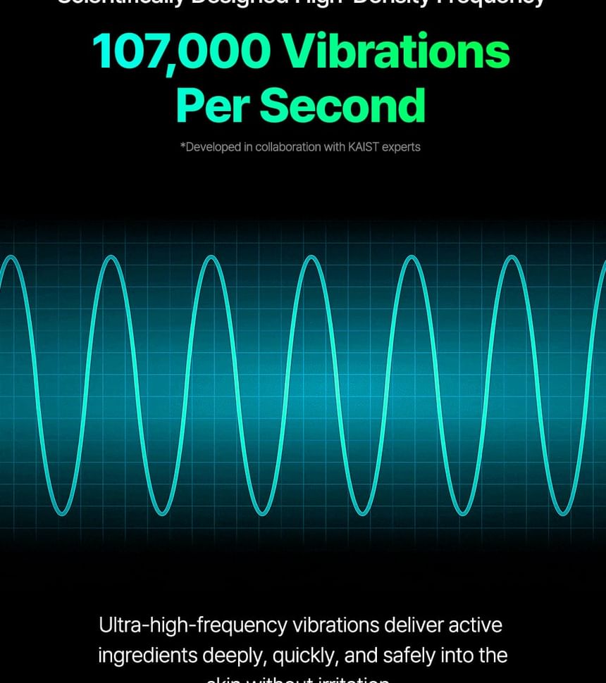 This device with 107,000 vibrations per second helps with transparent radiance, smooth pores, middle part elasticity, and sharp jaw line.