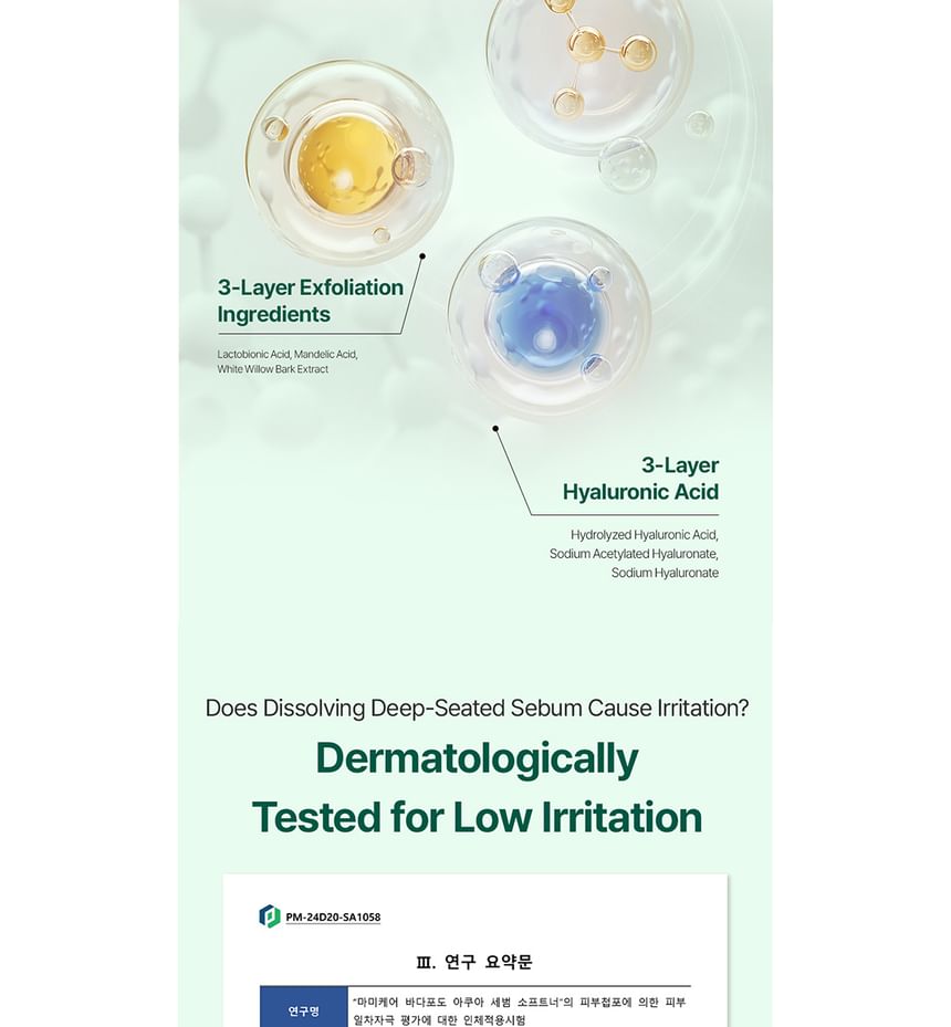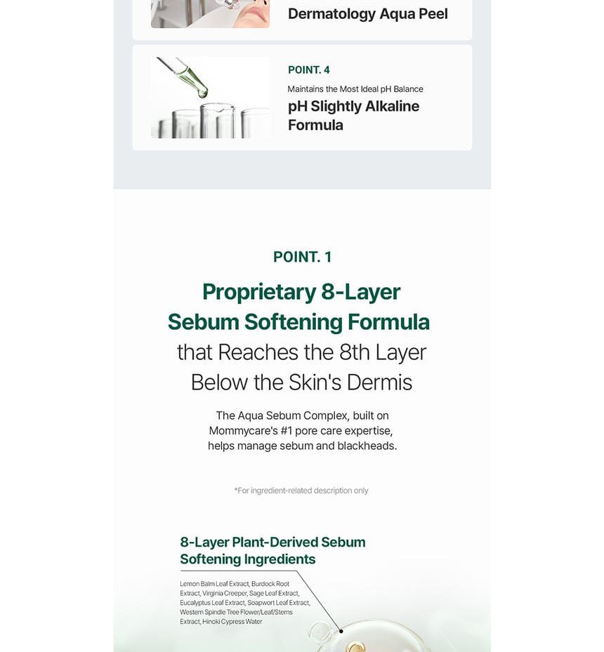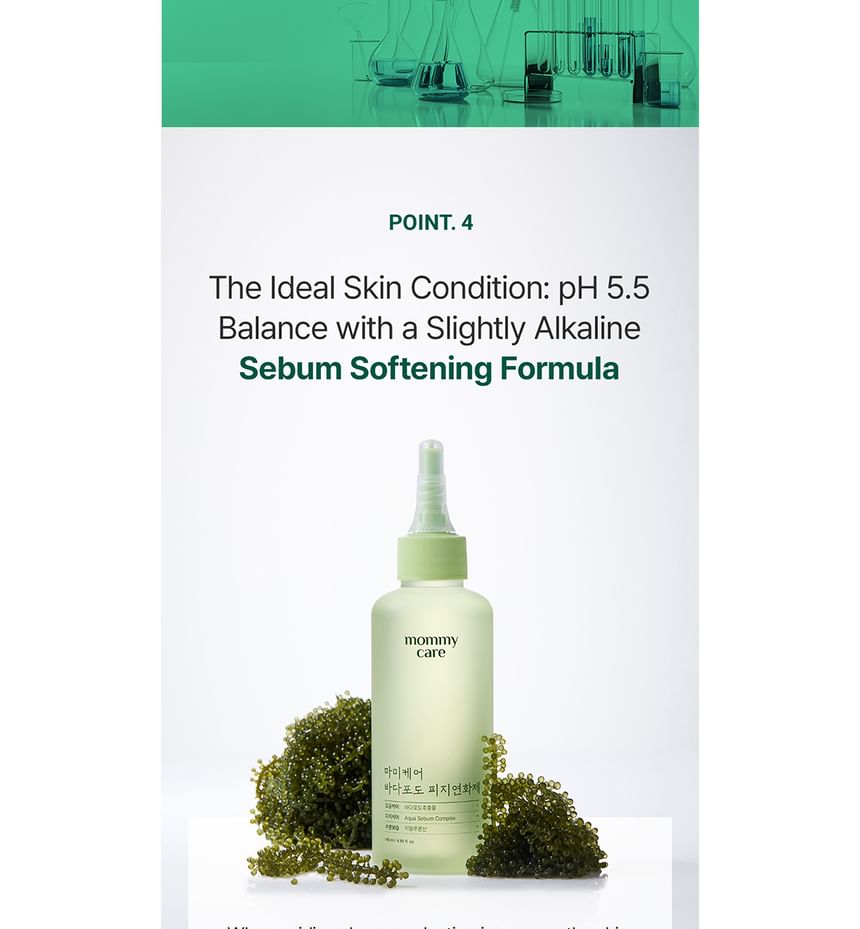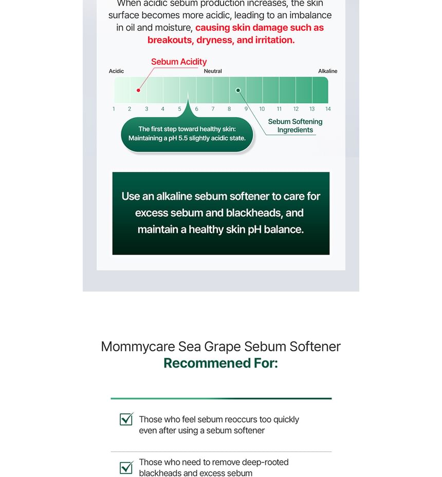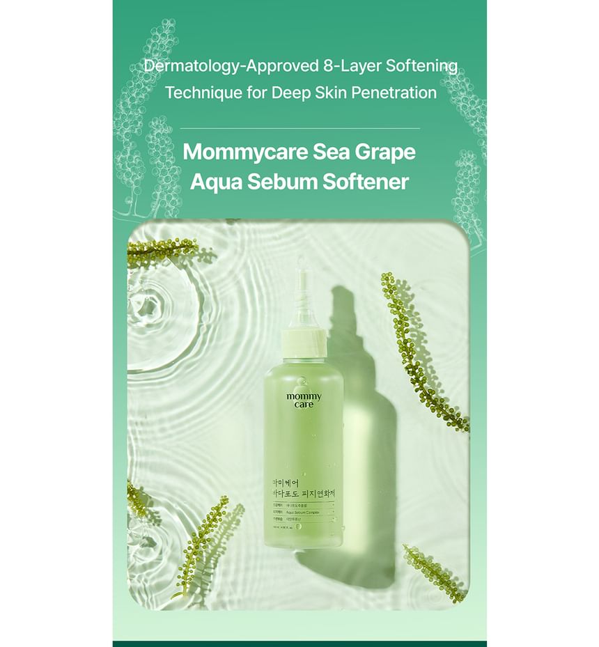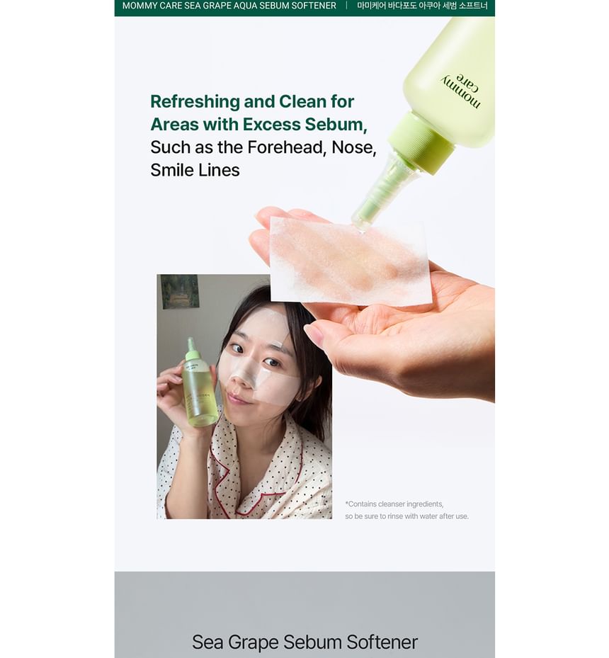 mommy care’s Sea Grape Aqua Sebum Softener tackles it all! Powered by a trio of exfoliating acids (PHA, AHA and BHA) and eight botanical sebum care ingredients, the sebum softener works to dissolve dead skin cells, blackheads and excess oil in your pores.