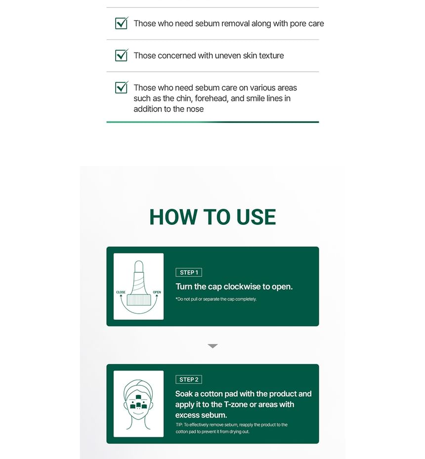 1. Soak a cotton pad with the sebum softener and apply it to the T-Zoneor areas with excess oil.