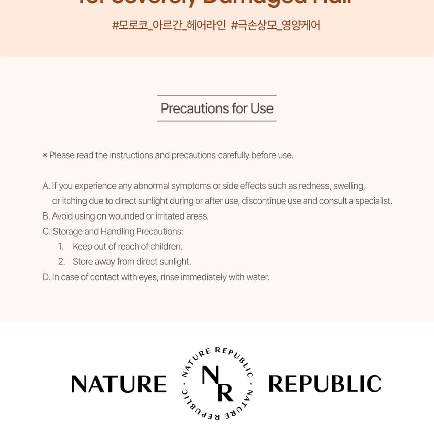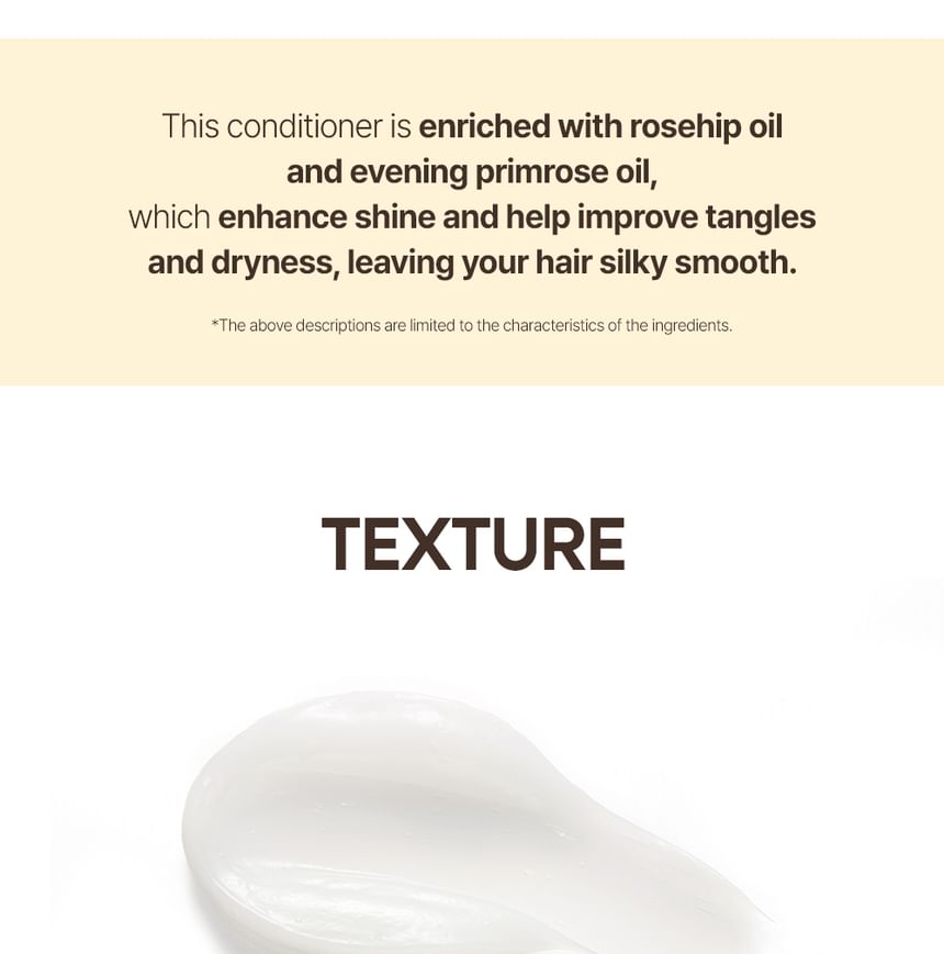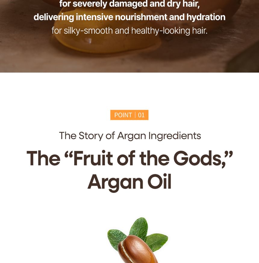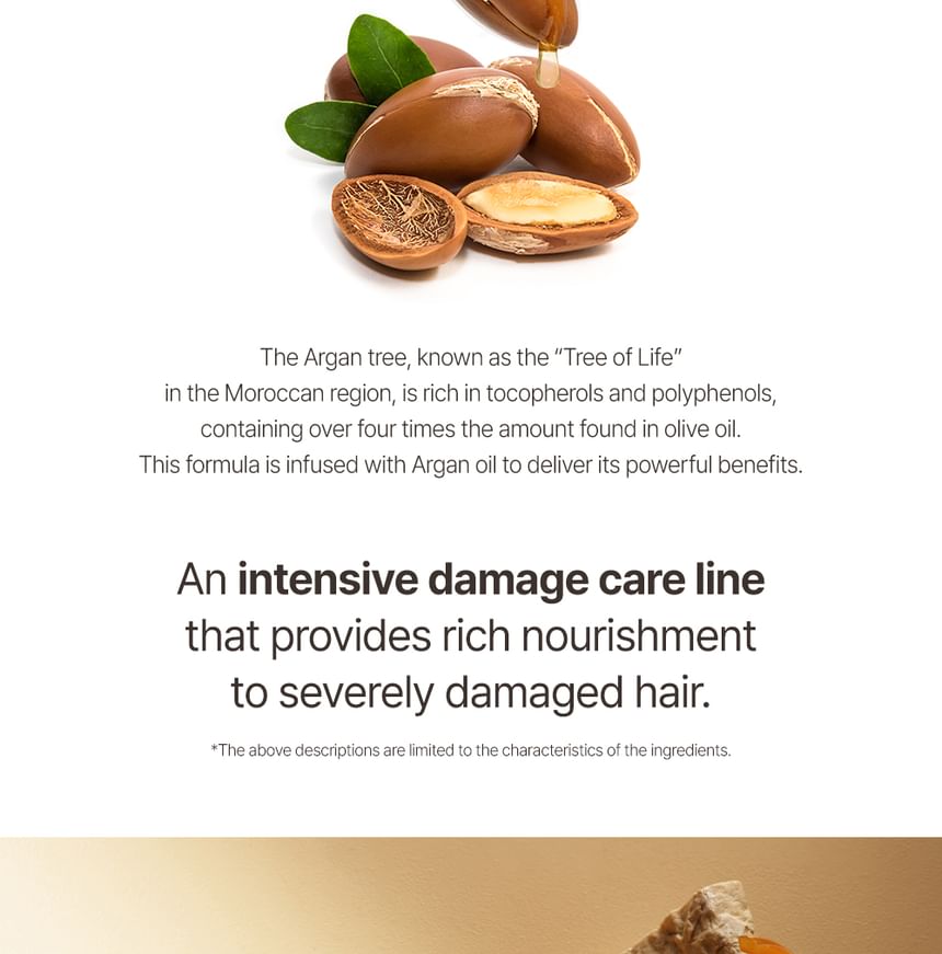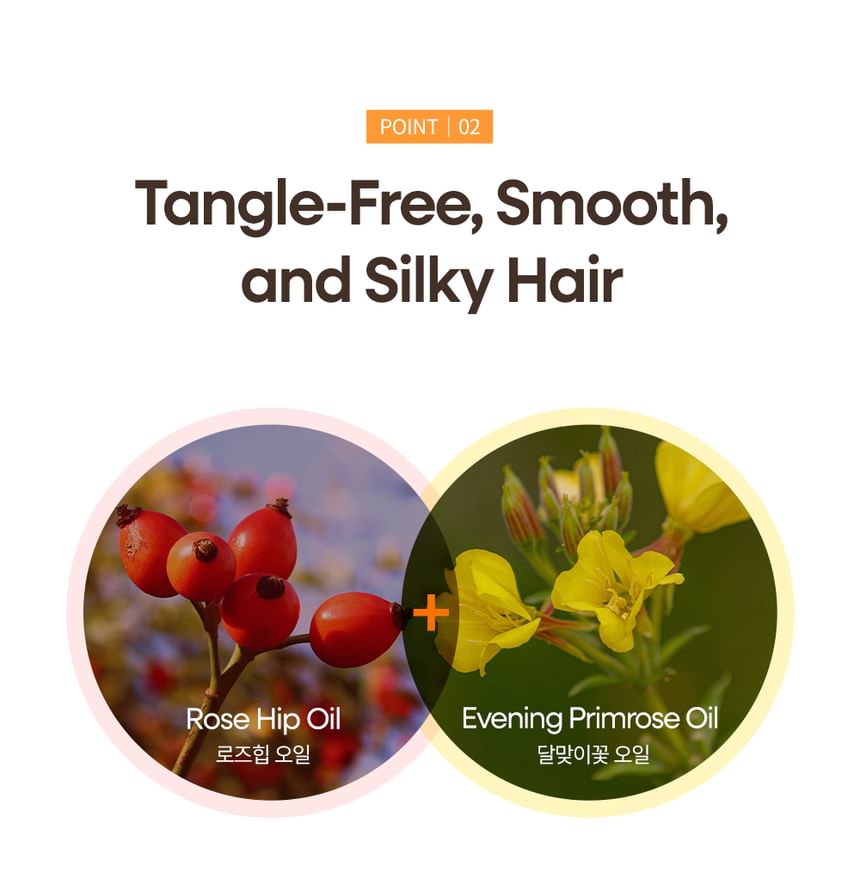 The ingredient of argan oil provides moisture and nourishment to severely damaged hair, and the ingredients of rosehip oil and evening primrose oil make the hair texture feel soft and improves its shine.