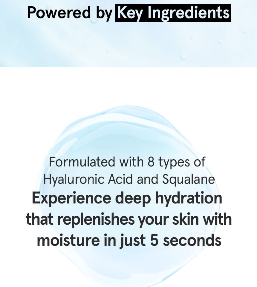 Water, Hydrogenated Polydecene, Glycerin, Dipropylene Glycol, Cetyl Ethylhexanoate, Caprylic/Capric Triglyceride, Limnanthes Alba (Meadowfoam) Seed Oil, Butylene Glycol, Hydroxyacetophenone, Propanediol Squalane, Ethylhexylglycerin Adenosine, Zea Mays (Corn) Kemel Extract, Xanthan Gum, Allantoin, Disodium Edta, Melia Azadirachta Leaf Extract, Sodium Hyaluronate, Hydrolyzed Hyaluronic Acid, Coccinia Indica Fruit Extract, Hyaluronic Acid, Fructan, Glucose, Aloe Barbadensis Flower Extract, Solanum Melongena (Eggplant) Fruit Extract, Simmondsia Chinensis (Jojoba) Seed Oil, Corallina Officinalis Extract, Curcuma Longa (Turmeric) Root Extract, Ocimum Sanctum Leaf Extract, Polyglutamic Acid, Hydrolyzed Sodium Hyaluronate, Hydroxypropyltrimonium Hyaluronate, Potassium Hyaluronate, Sodium Hyaluronate Crosspolymer, Pentylene Glycol, Sodium Acetylated Hyaluronate, Titanium Dioxide (Ci 77891), Iron Oxides (Ci 77491)