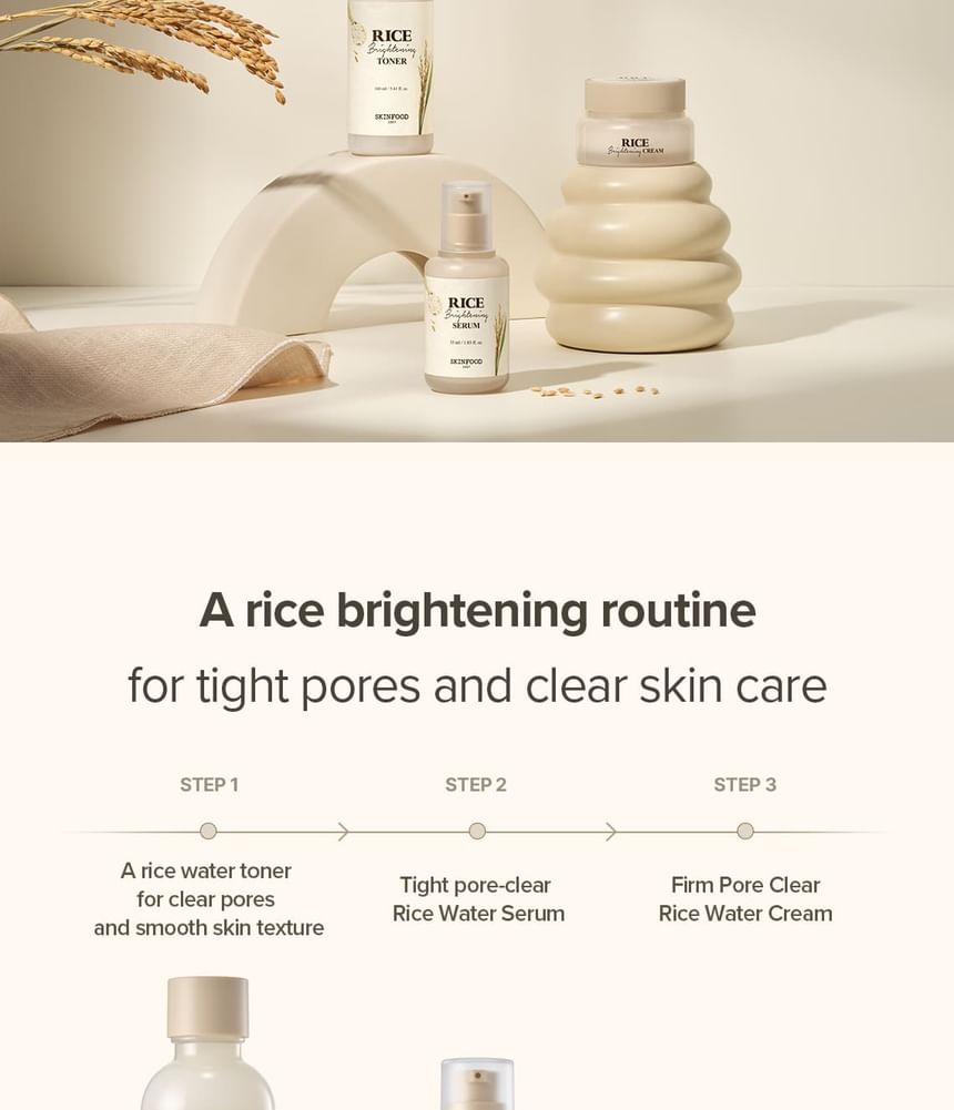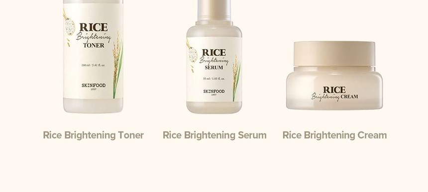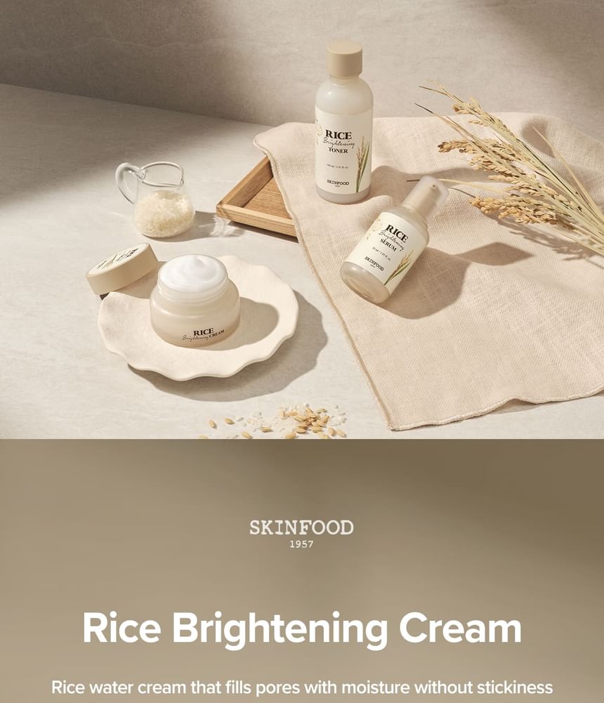SKINFOOD’s Rice Brightening Cream evens skin tone and supports skin clarity with SKINFOOD’s patented Rice Pore Complex containing rice water, hydrolyzed rice protein and 17 amino acids.