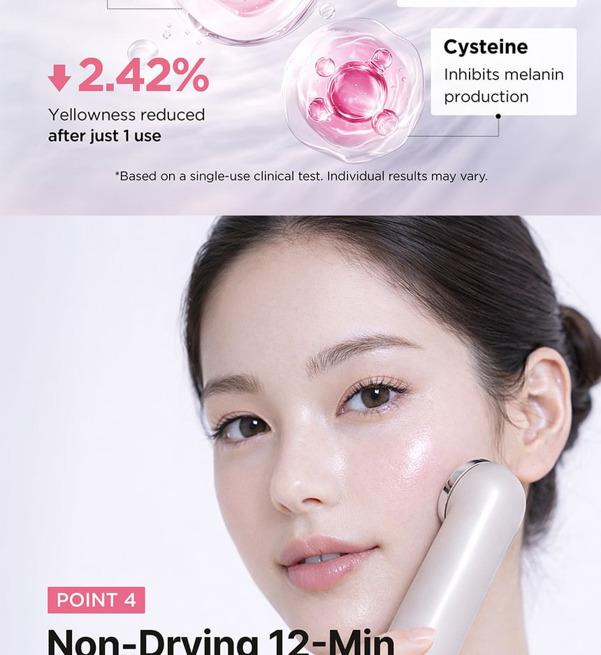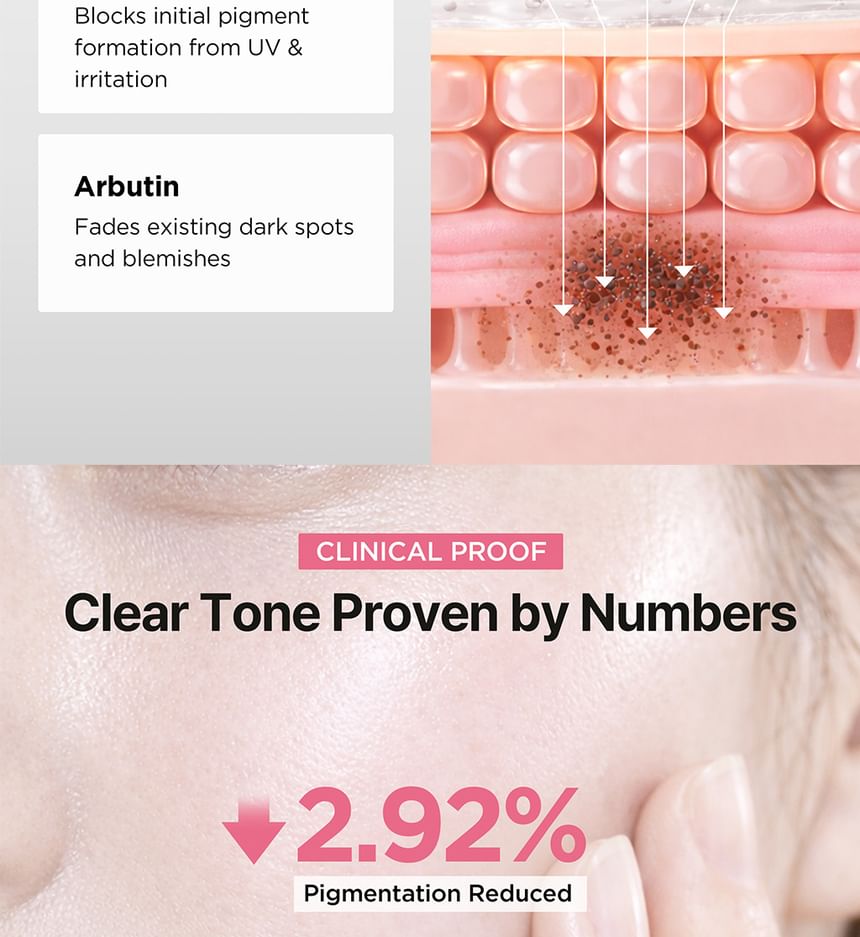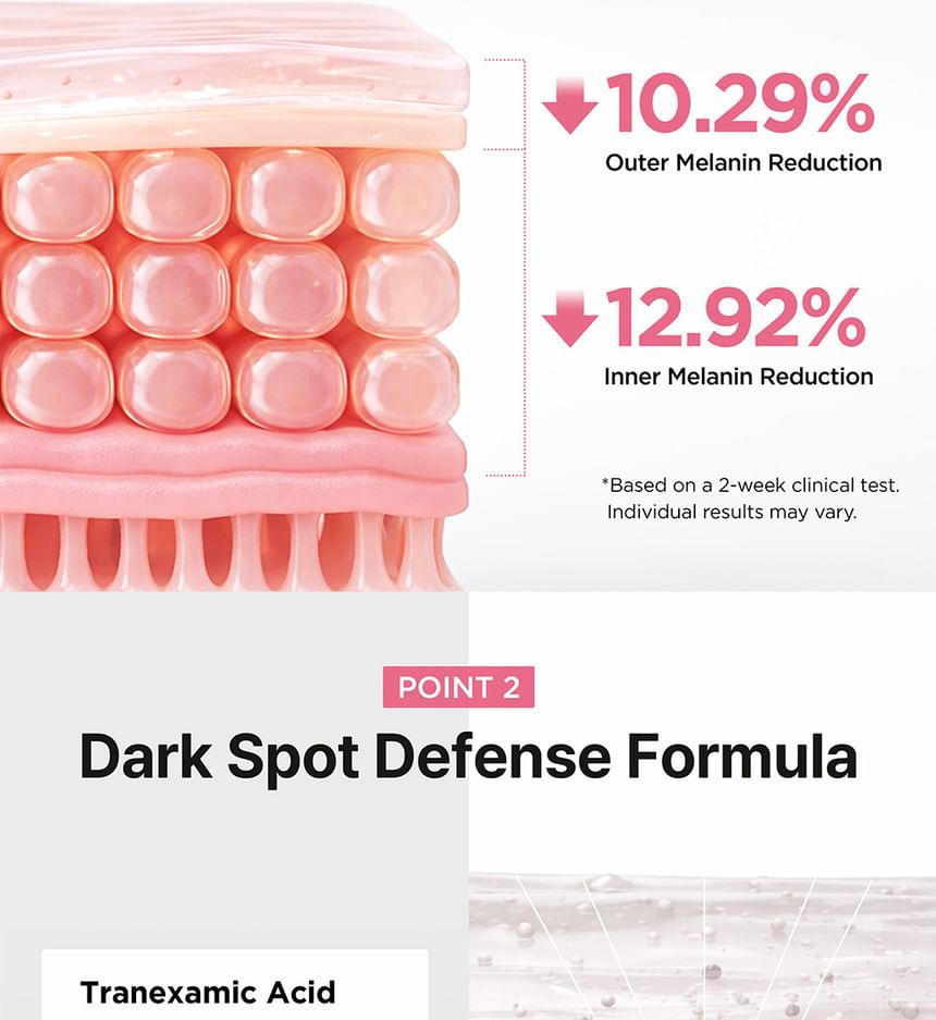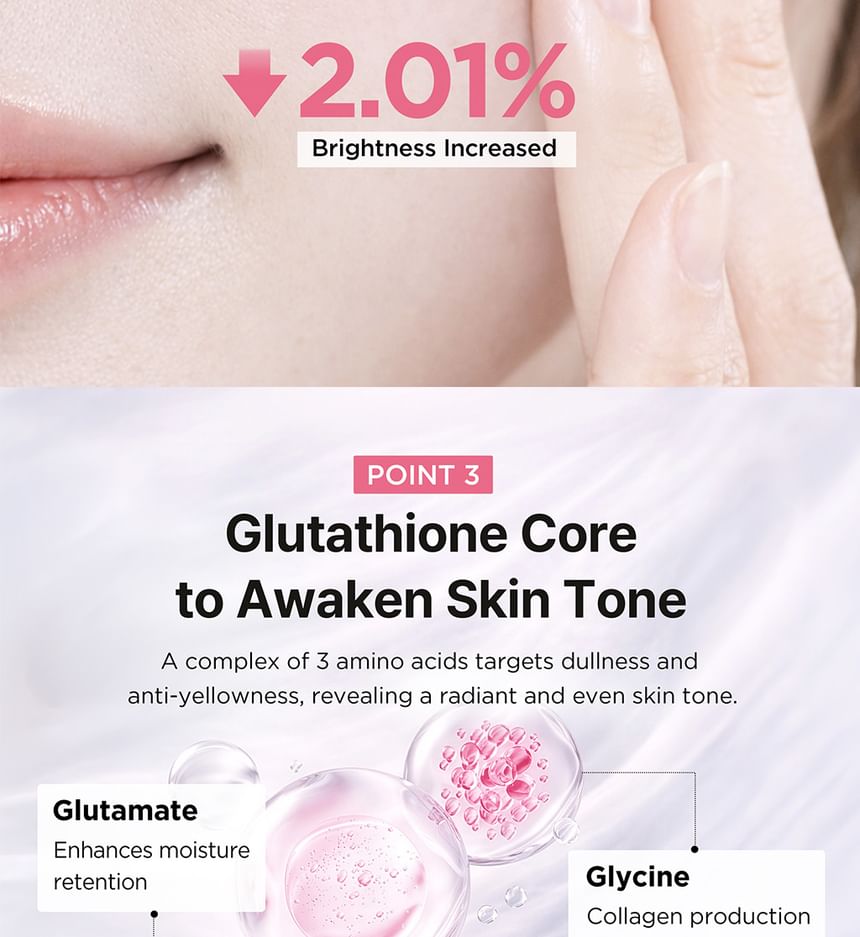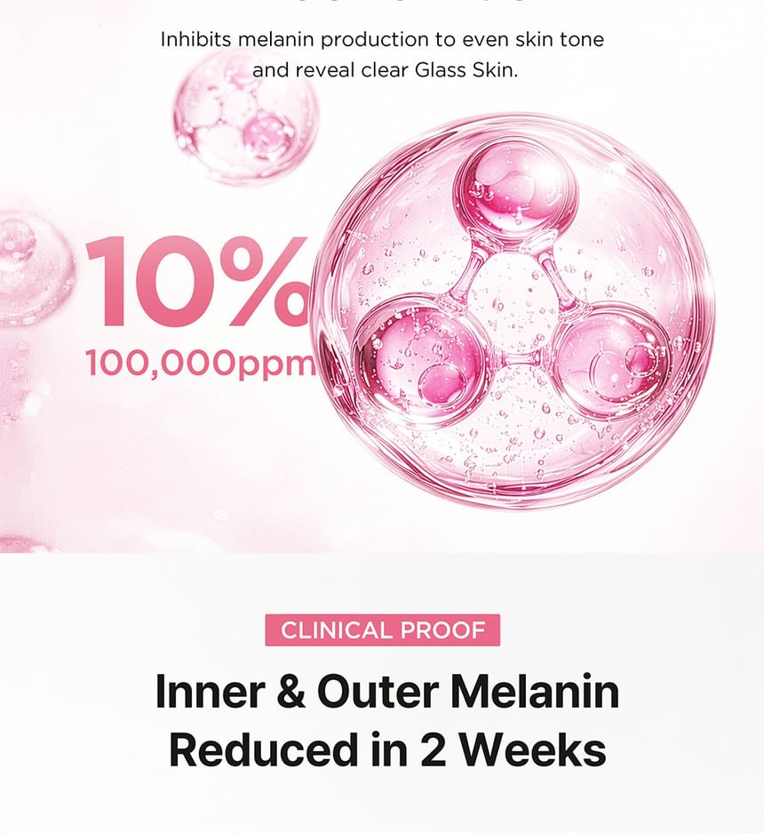 • Infused with 10% niacinamide, arbutin, glutathione, and tranexamic acid