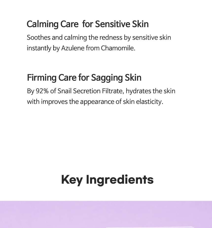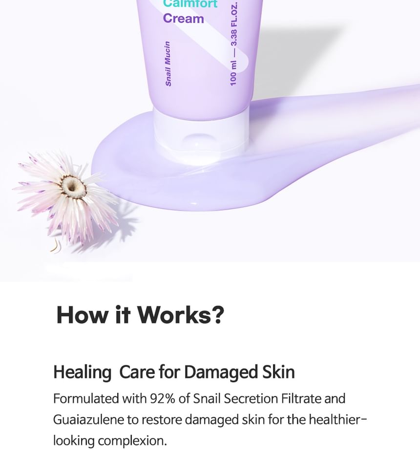 A soothing cream formulated with 92% of Snail Secretion Filtrate and Guaiazulene that help restore damaged skin and enhance skin elasticity.