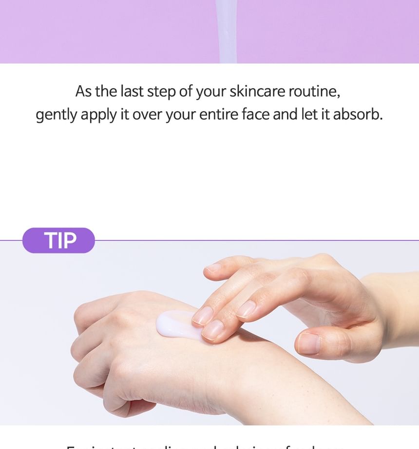 At the last step of the skincare routine, apply a moderate amount evenly on the face and pat lightly for better absorption.