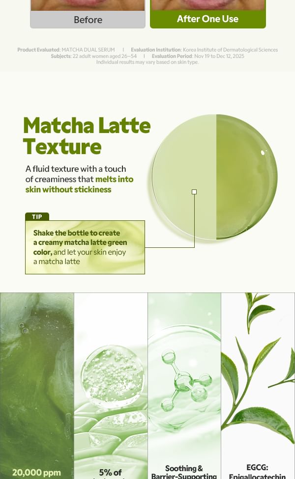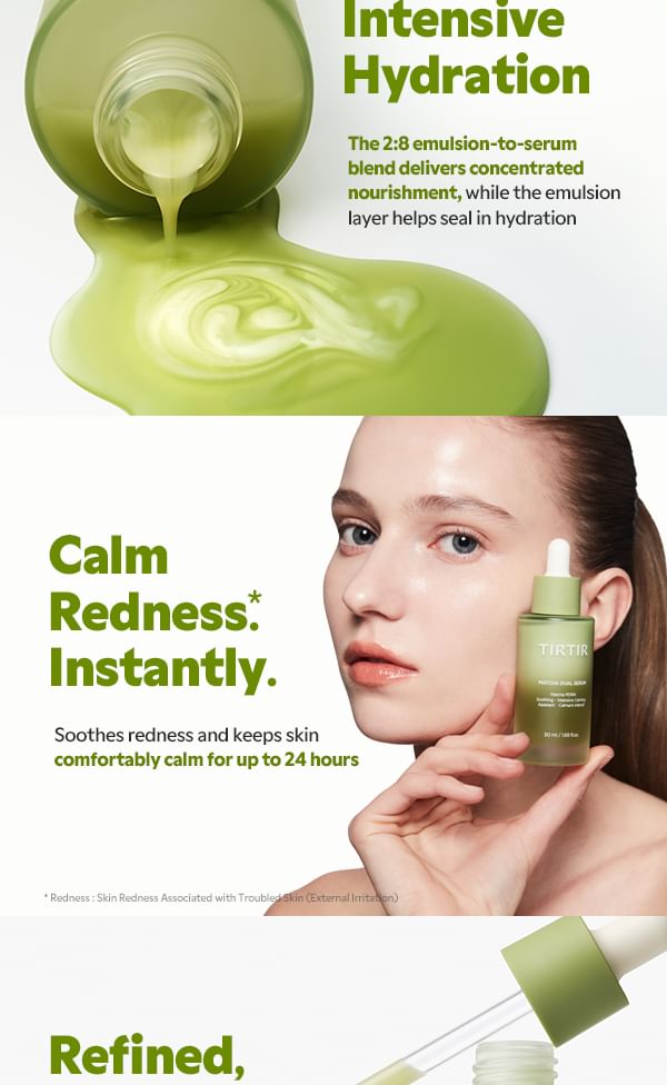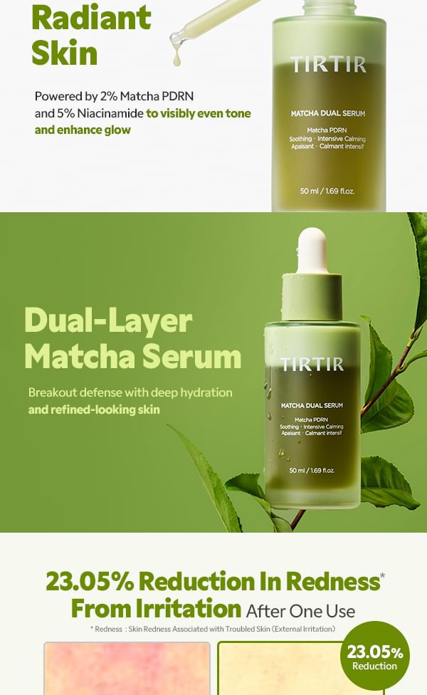 Introducing the TIRTIR Matcha Dual Serum — a clinically proven, bi-phase serum engineered for intensive redness relief, deep hydration and skin brightening.