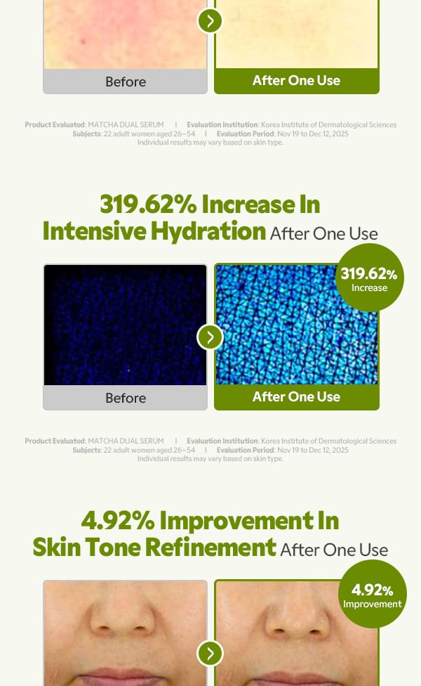Clinically tested to deliver a 33.48% improvement in redness after 24 hours, a remarkable 319.6% moisture increase on irritated skin, and a 149.9% hydration boost — the Matcha Dual Serum is the most concentrated treatment step in the TIRTIR Matcha Line, designed for those seeking targeted, measurable results for sensitive, redness-prone, dull or dehydrated skin.