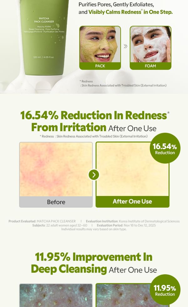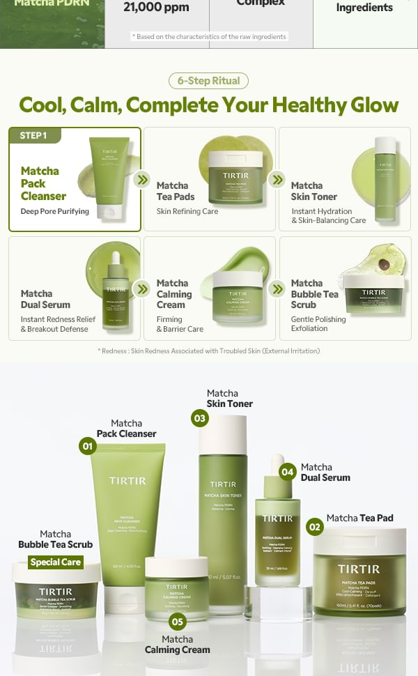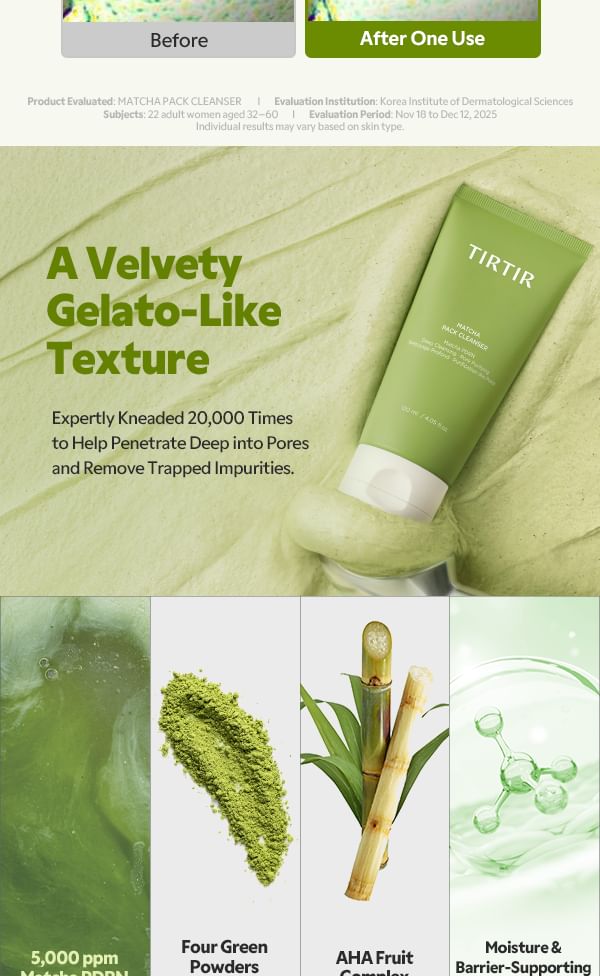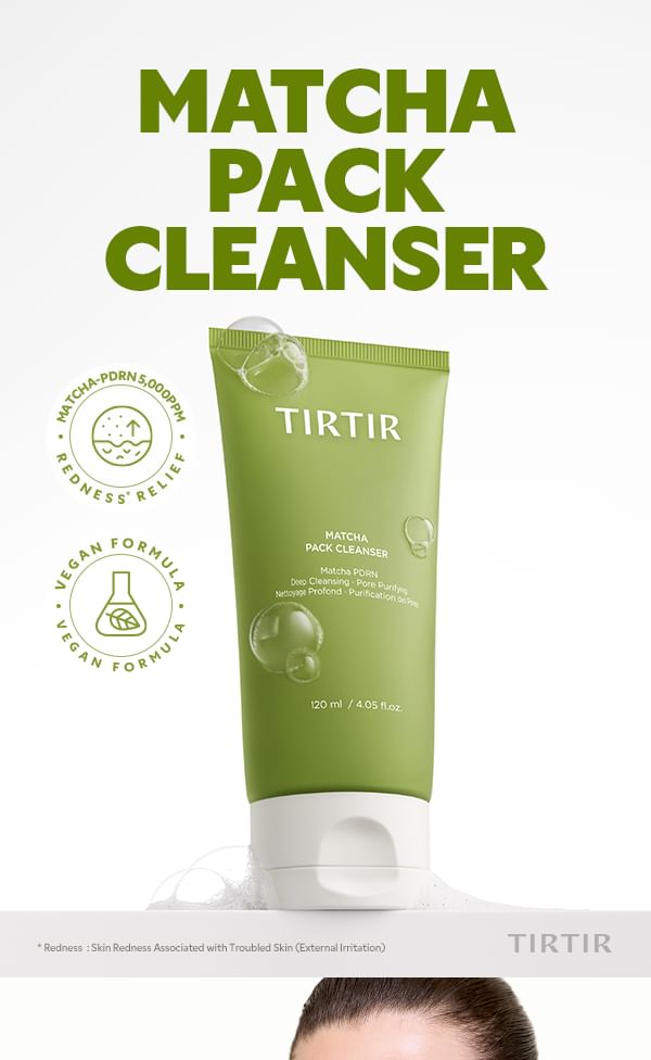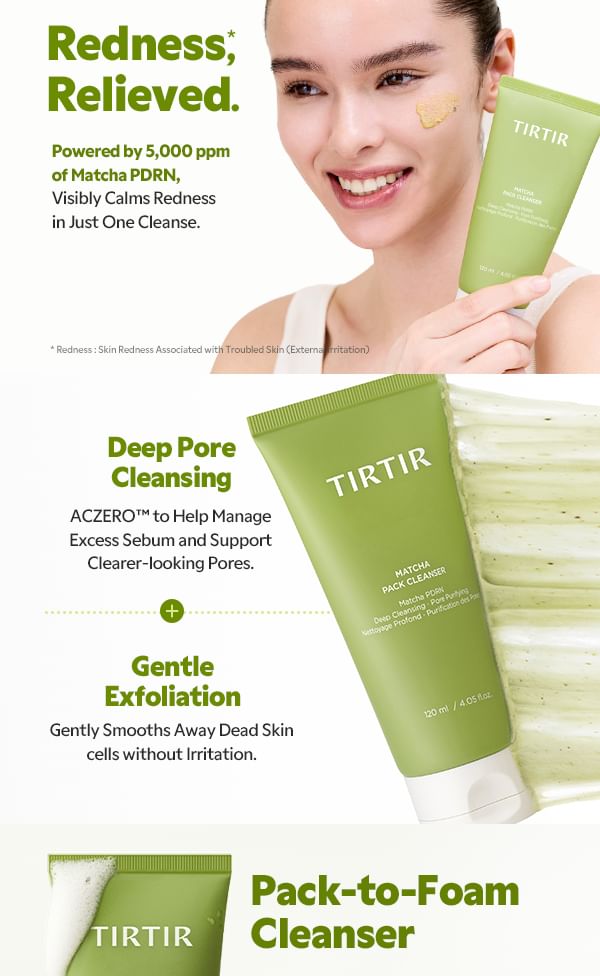 Introducing the TIRTIR Matcha Pack Cleanser — a unique sticky pack-to-foam cleanser that redefines the cleansing step for sensitive, redness-prone and sebum-concerned skin. Formulated with Matcha-PDRN (5,000 ppm) and a powerful Dual Green Powder complex, this innovative T0 (pre-step) cleanser delivers deep pore cleansing, gentle exfoliation and visible redness relief — all in a single, satisfying step.