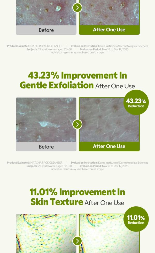 11.95% improvement in deep cleansing, 43.23% improvement in gentle exfoliation, and 11.01% improvement in skin texture after one use.