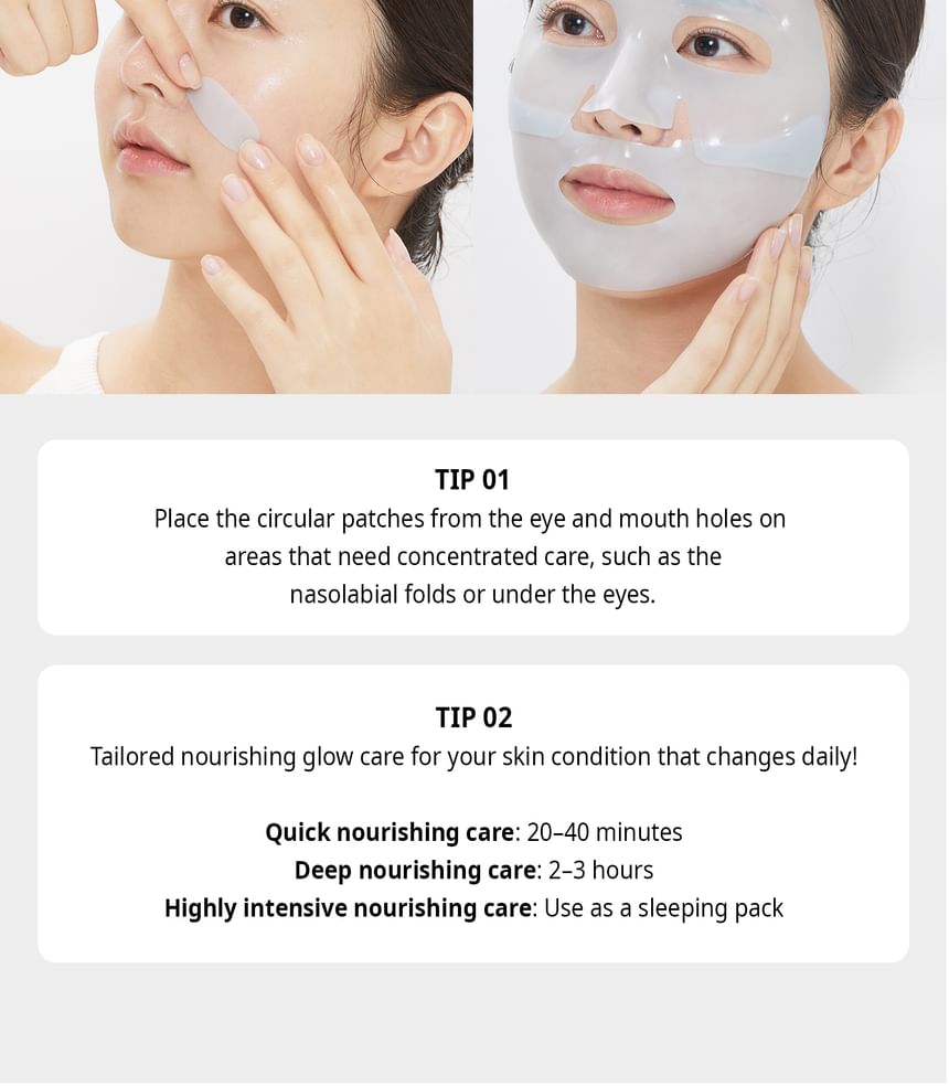 Customizable Soothing Care:This form-fitting hydrogel mask offers immediate cooling to the skin as the active ingredients absorb and deliver results. Wear the mask for 20-40 minutes for optimal adherence, 2-3 hours for intensive care, or overnight for deep nourishment.