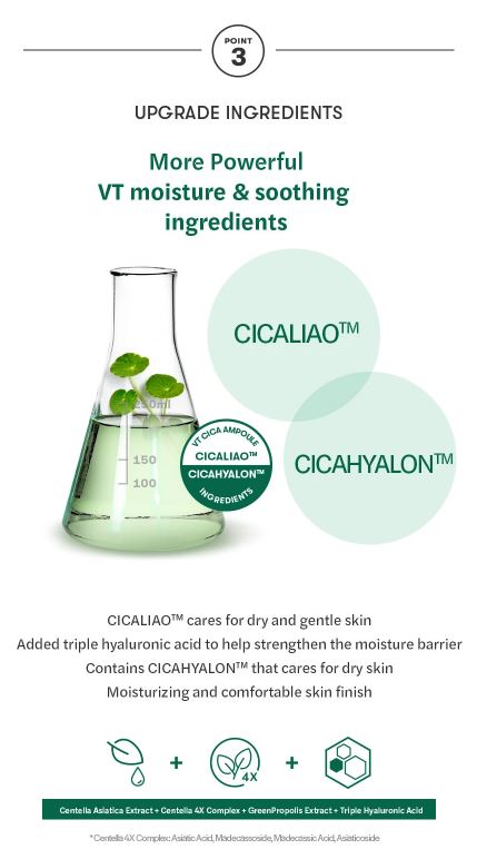 Centella Asiatica Extract + Centella 4X Complex + Green Propolis Extract + Triple Hyaluronic Acid.