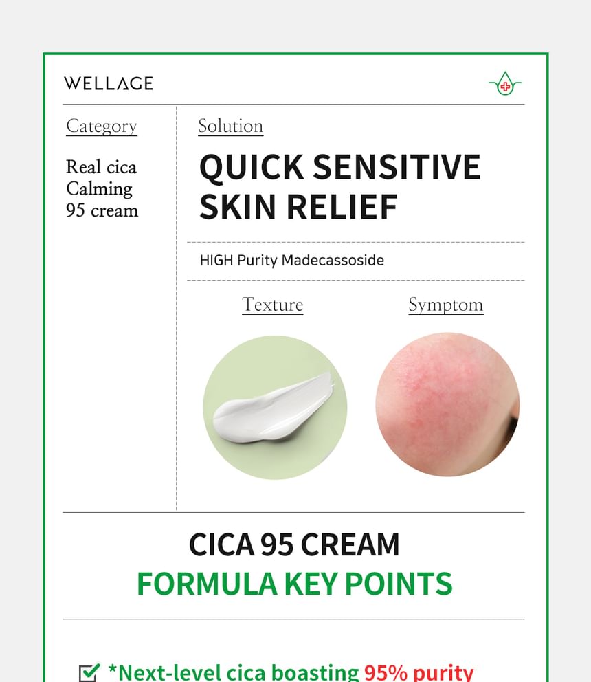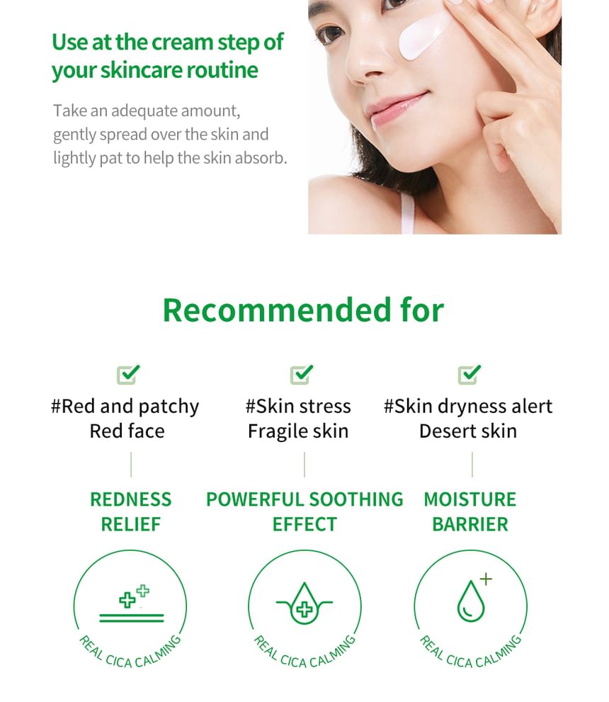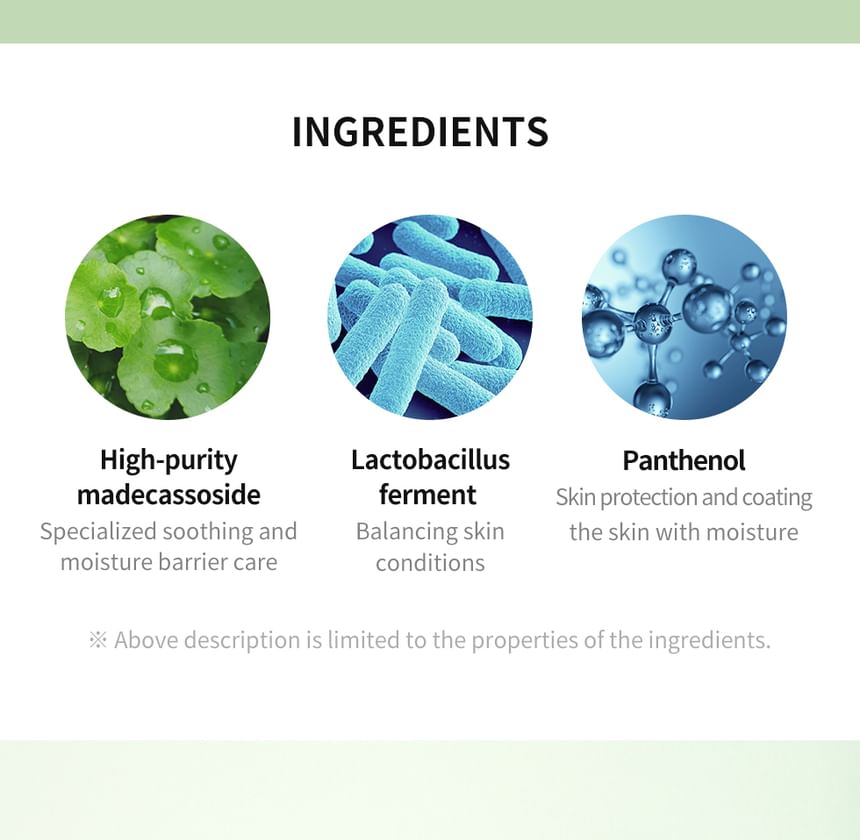 Water, Glycerin, Caprylic/Capric Triglyceride, Butylene Glycol, Cetearyl Alcohol, Isotridecyl Isononanoate, Dicaprylyl Ether, 1,2-Hexanediol, Pentylene Glycol, Chlorella Vulgaris Extract, Hydrolyzed Corn Starch, Lactobacillus Ferment, Sodium Hyaluronate, Centella Asiatica Leaf Extract (350 ppb), Diglycerin, Polyglyceryl-3 Methylglucose Distearate, Vinyl Dimethicone, Hydroxyethyl Acrylate/Sodium Acryloyldimethyl Taurate Copolymer, Cetearyl Olivate, Sorbitan Olivate, Panthenol, Glucose, Diisostearyl Malate, Fructooligosaccharides, Fructose, Sodium Polyacryloyldimethyl Taurate, Palmitic Acid, Dipropylene Glycol, Stearic Acid, Hydrogenated Polydecene, Ethylhexylglycerin, Caprylyl Glycol, Dipotassium Glycyrrhizate, Adenosine, Sorbitan Isostearate, Polyglyceryl-10 Laurate, Polyglyceryl-5 Polyricinoleate, Trisodium Ethylenediamine Disuccinate, Trideceth-10, Hydrogenated Lecithin, Sodium Stearoyl Glutamate, Lecithin, Sucrose, Madecassoside (9,100 ppb), Tocopherol, Asiaticoside(950 ppb), Madecassic Acid (400 ppb), Asiatic Acid (300 ppb), Xanthan Gum